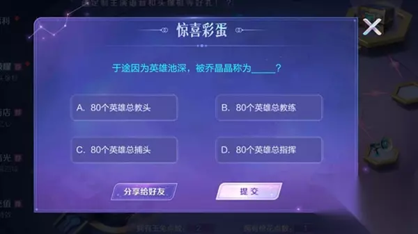 王者荣耀开启“与你相遇共赴荣耀”彩蛋活动,活动时间为7月29日-8月8日,玩家参与答题挑战可获语音头像框等奖励,其中一道题目为于途因英雄池深被乔晶晶称什么,答案可在相关攻略中查看。