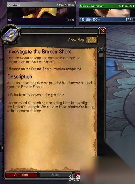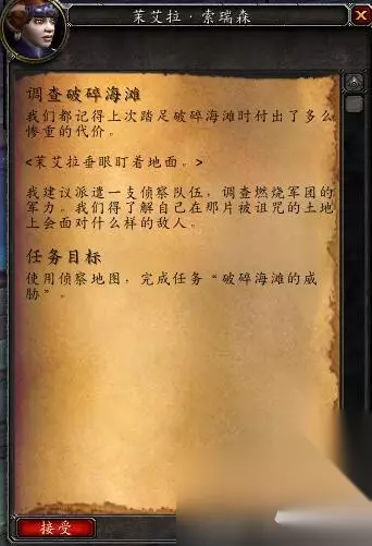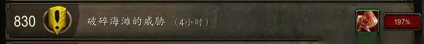 破碎海滩的威胁 破碎海滩的威胁:派遣勇士调查燃烧军团在破碎海滩的活动,830随从装等要求,4小时。 背叛希望:据说,恶魔丹塔利纳克斯能吸干凡人心中所有的希望。必须让我们的部队消灭他,830随从装等要求,12小时。 完成之后就能够接到新任务,“调查破碎海滩”!不过这个任务暂时无法完成。