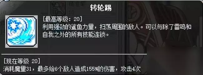 二转主攻,和波涛连招即为60级前的主要攻击方式。在身体四周360°范围造成伤害。转轮以前是主攻技能之一,因为延迟低,和其他技能连招速度很快,转轮毁灭秒段数高于霹雳毁灭,躲BOSS技能较为容易。 但由于转轮范围实在太小,伤害一般,刷图使用频率一般,加之后续霹雳、台风延迟不断降低,正在逐步失去优势。该技能目前处境尴尬,后续可强化也可抛弃。