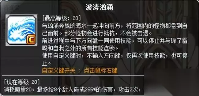 奇袭最重要的位移技能,具备【突进】、【击退】、【急停】、【伤害】四项功能,位移距离适中,不可空中使用。波涛历经多个版本的反复修改,从原先的僵硬变为顺滑,最适合用来收招。 使用技巧:1.连招后接波涛,调整走位;2.右键点击出现C字样时,该技能可通过波涛+下、波涛+波涛两种方式进行急停。右键点击C字样消失时,该技能仅可通过波涛+下方式进行急停;3.使用波涛后按左右任意方向键走动,可达到几乎无后摇的效果;4.与一转疾电连招,赶路飞快;5.可将小怪或道场BOSS推向自己想要的方向。 急停:近年新增,使用急停可缩短波涛位移距离,提高躲避效率。由于波涛本身距离适中,刷怪时可以不开启急停,避免影响效率。但在掉落物较多的BOSS战还是... 更多关于 的内容,请查看本站相关系列文章,感谢您的支持与理解。
