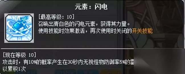 奇袭专属元素【开关技能】,上线及复活后记得打开。打开后每次攻击可积累雷电增益,最高5层,通过后续几次转职的被动进行加强,最终可以达到【每次攻击100%积累一层雷电增益】的效果。