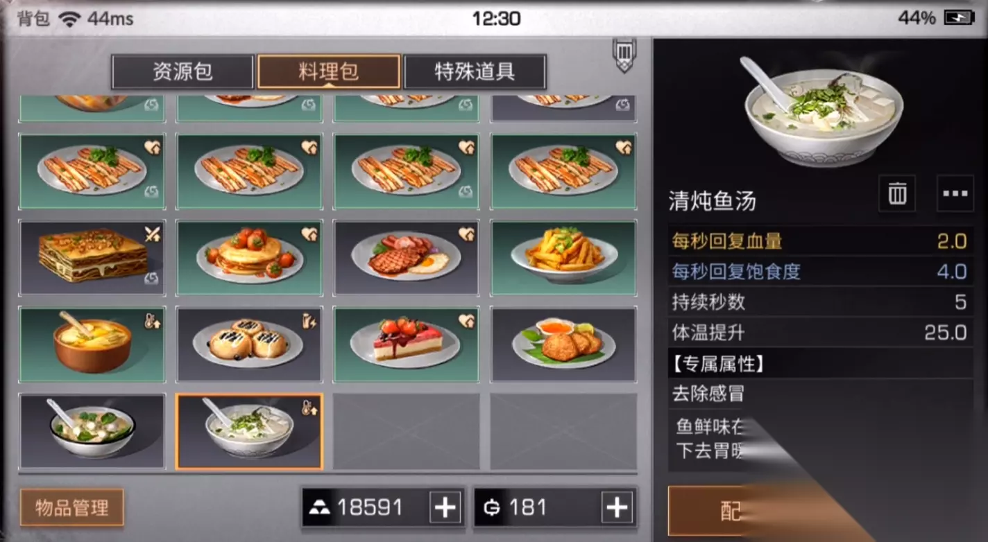 9、剁椒鱼头 要用到一份穿天椒、一份鳙鱼。食用后可提升对人形怪、野生怪,以及污染怪的伤害。 10、清蒸鲥鱼 原材料是一份鲥鱼、三份同样基材。它会在900秒之内,增加2.5%的移速。此外还能同时提升伐木主副资源的暴击,数值为10%。 11、红烧蛇鱼 需用三份蛇鱼,加上三种同样基材。和前面鲥鱼不同的是,它可提升10%挖矿主副资源暴击。 12、炭烧红稠鱼 有着提升移速和血量上限的作用。