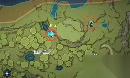 当你完成前置任务之后,会接到全新的任务【梦境与树】,跟随任务即可到达。 1、首先我们在红圈位置的七天神像出发, 然后通过红色箭头所指的路进行移动。