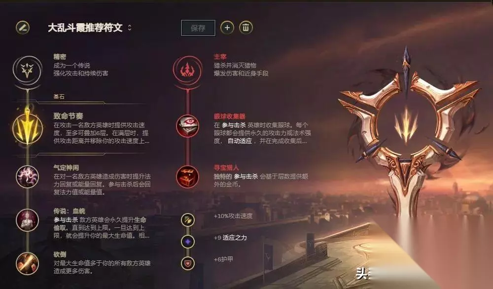 主系符文:致命节奏+冷静+血脉+砍伐 副系符文:眼球收集器+ 宝藏猎人 符文解析:霞需要很高的攻速来快速补满羽毛,而霞的攻击距离只有525,她依靠致命节奏增加的攻击距离来保证输出环境。 疾刀侠的技能CD很快,对法力的依赖度很高。你可以淡定从容,保证夏兰就够了。 13.1版本中,小兵的偷血效果调整为60%,血统可以再次增加。 击倒会增加对高生命值敌人的伤害。 眼睛收集器增加输出。 宝藏猎人很快就打出了三件重击。 【出装和加点】