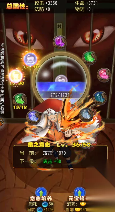 玩家需要通关相对应副本才可达到开启条件,通过新手引导指引玩家进入到火影之路系统界面,玩家达到15级开启火影之路,玩家可以消耗意志来培养,50点意志会长50点经验(脸好会暴击,暴击加100经验),每级可增加玩家属性值,意志可通过刷副本来获得,幻生条件需玩家点八门系统主角卡牌升级为紫色后,在火影之路里把初级忍者培养到10级可以点击觉醒即可进入火之意志界面激活雷之意志能量槽根据相对应幻生条件依次开启意志能量槽。