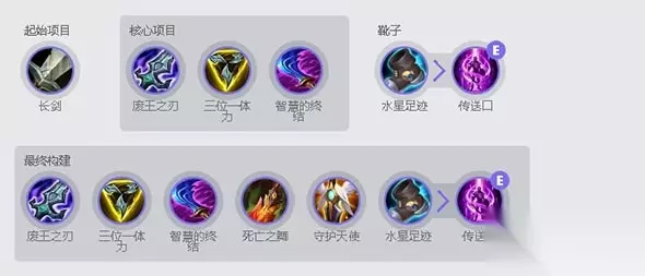 一级出门:首先一级出门毫无疑问的选择长剑,没有什么是比长剑来的更合适的了。如果在面对敌方上单是剑姬蕾欧娜、鳄鱼雷克顿或是青钢影卡密尔等强势AD上单英雄时可以选择小布甲,增加前期防御能力和对线持续能力。 核心三件套:破败王者之刃、三项之力和智慧末刃。 六神装:破败王者之刃、三项之力、智慧末刃、死亡之舞、守护天使,鞋子选择水银之靴后期可以合成传送(也可以选择合成中娅,增加保命能力和容错率)。 破败王者之刃:增加线上的对拼和续航能力,同时在3次的普攻和技能攻击后可以偷取敌方移速,让艾瑞莉娅可以拥有更高的移速接近敌方英雄。 三项之力:三项之力应该是非常契合艾瑞莉娅的装备了,不管是生命值提升、攻速提升还是技能急速和额外移速提升都可以全方面的提升艾瑞莉娅的综合属性。 智慧末刃:智慧末刃所提供的额外魔法伤害加成可以完美匹配艾瑞莉娅的被动:在攻速加成叠满后平A普攻造成额外魔法伤害。同时智慧末刃的回复属性也可以配合破败进一步提升艾瑞莉娅的续航能力,尤其是中后期的游戏单带的时间段。 死亡之舞:死亡之舞自改版成变为所有伤害的减免后,已经开始无限的适合于上单的单带型战士英雄了,尤其是我们在使用艾瑞莉娅时,面对敌方拥有爆发型的法师或刺客英雄时也是完美契合。 守护天使:复活甲就不用多说了,提升团队整体的容错率。艾瑞莉娅在没有复活甲时候的可以1V1、1V2,有了复活甲以后可以1V4、1V5,就可以随心所欲的大喊“我要打十个!” 鞋子选择:水银之靴不用多说,提升魔抗和韧性,尤其是韧性的提升对于需要七进七出的艾瑞莉娅来说简直是如虎添翼。后期合成中娅沙漏进一步提升团队容错率,也可以更大胆放心的开团了。 备选装备:黑色切割者、兰顿之兆、斯特拉克的挑战护手、烈阳魔刃、冰霜之心。 三、召唤师技能、推荐符文: 召唤师技能:艾瑞莉娅最常见的选择就是闪现+点燃了,基本大部分的刀妹玩家都是这样选择的带法,线上强势、压制力强,带点燃单杀一次后容易滚雪球,综合属性好。