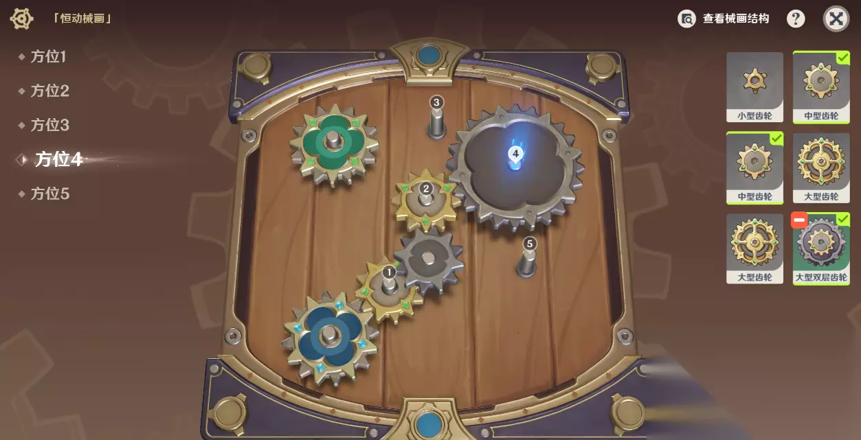 顺序: 方位1-中型齿轮 方位2-中型齿轮-切换至上层 方位4-大型双层齿轮-翻转 方位3-大型齿轮 如下图即可