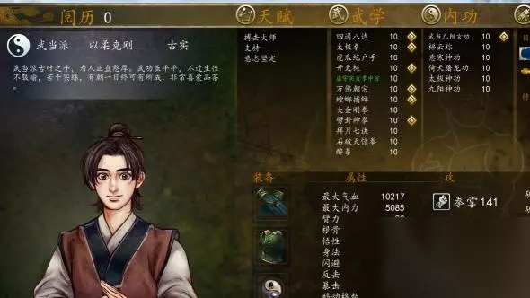 7、古实。据说是可以和方公公合称武当双侠传的另一位,前两个周目没带,这个周目特地带上爽一下。首先就发现了古实最大的好处,太节省资源了!!自带武当九阳和梯云,领悟九阳神功啊有木有,他老爹给太极神功。倚天屠龙只有他和方公公可以学,然后皇子的寒意果断给他加反击。嗯,只要做了孟婆任务领悟九阳就起飞了。招式方面气功路线被大师兄学完了。于是剩下的拳法全部丢给他。刚刚好除了鹰爪功和天山折梅手要求身法学不了,正好12招。如果你想玩究极古老实,一定要让他自己去领悟九阳和万佛朝宗。另外我发现万佛朝宗貌似伤害和拳掌挂钩?反正他用万佛的伤害比大师兄要高。