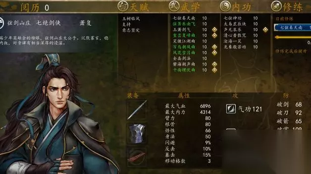 10、萧复。萧复其实也基本上算是最终形态了。内功方面基本全是专属,领悟太乙星辰诀。平时带声无哀乐的BUFF。最后一本给了龙象,因为萧复血真的太少了。而且龙象可以解锁震撼,虽然没什么用,不过也算是锦上添花。招式也是能学什么学什么,都是专属,因为任剑南学的全是剑法也不存在抢资源的问题了。