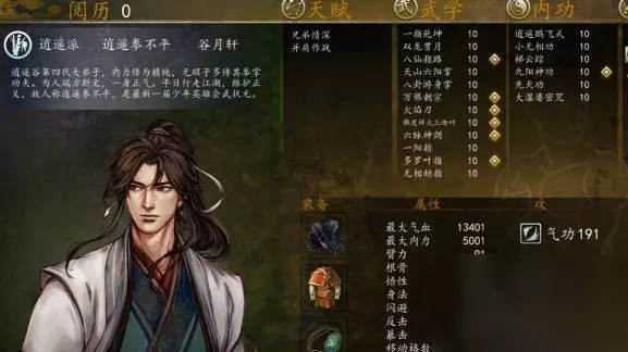 1、大师兄。首先大师兄 内功方面算是标配吧。梯云解决腿短,大师婆解锁移花、九阳先天标配。招式选择指法气功开局,全程一个拳法都不学,包括空明拳,前期确实很无力,可是后期一个火焰刀秒BOSS谁用谁知道,另外图上内力是喝茶喝上去的。