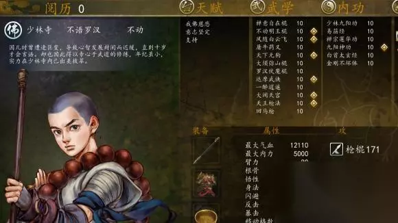5、不动。因为要偷东西,对,不动的天赋保证了杀不死人,那就靠不动把怪拉到角落,小师妹卡位,不动反击也没关系,等他慢慢回血,慢慢偷。好了先说内功,不动的血牛属性就在于初始的两个少林九阳和易经经加血非常多,领悟的白首太玄经也是加血多的。九阳必学,不动的定位是T,那就让他去保护队友,而且九阳的第二个效果能破了我佛慈悲。不动也是可以打死人的了。金刚不坏体,也是属性非常好的,而且不浪费资源,貌似只有他和史义可以学。最后一本因为龙象我给了校服,所以就学了禅宗这种不浪费资源的,反正不动真不缺龙象那点血。招式的话也是能学什么学什么,不动刚刚好能学12招,另外天王枪法一定要在恶人谷刷出来,打走来走去的那个阿萨辛,多读档,枪法 2的,很容易漏掉。