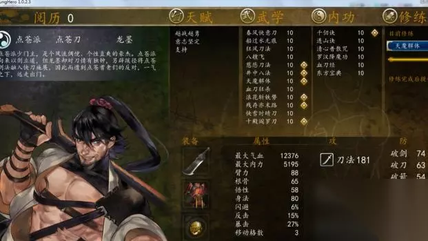 8、龙墨。内功自带千仞和连山,因为入队晚所以自己领悟了清心普善咒。补罗汉,血刀,最后一本虎啸,东方,吸星三选一,选择了东方。龙墨的招式格子真的非常吃紧,所以龙墨入队千万不要把一堆秘籍扔给他。首先慈悲,井中在吧中盛传很爆炸。据说他需要一本天魔。据说他领悟的浪花是全游戏单体最高伤害。阎罗刀和残存陌路必给。残存还带左右互搏。剩下两个格子就随意了,反正刀法那么多,于是天魔,骑士,龙墨一个浪花,秒天秒地。