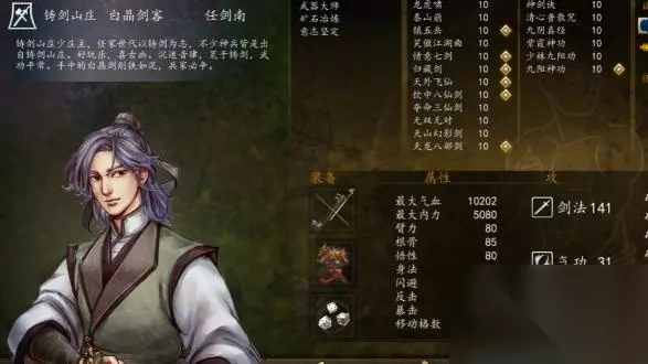 4、任剑南。任剑南主力,从头带到尾,一本九阴,拿了专属武器就起飞。内功自带两个,领悟少林九阳,紫霞撑内力,九阴撑四维,最后一本九阳撑属性的同时,镇五岳配合九阳的第二个技能秒怪那叫一个爽。招式方面因为剑法实在太多,就随便学了,反正剑法 2的也只能方公公学,专属镇五岳情义七剑非常强,归藏必学,领悟天外飞仙,八仙剑霸体,最后把笑傲江湖换成天龙八部剑,因为后期剑法上来了天龙是比笑傲攻击要高的。