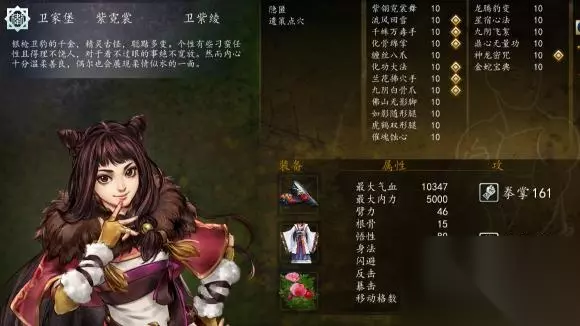 9、夜叉。好的队伍一定要带个美女养养眼,何况是夜叉这种伤害爆炸的美女。所以最后一个位置给了夜叉。因为入队太晚,入队的时候就有1W血7000 蓝,也因为入队晚,学完飞絮一看傻眼了。没给他留内功。虽然貌似也留不了什么给他。那就丢本吸星吧,让伤害更加爆炸。最后一个格子实在是没好的秘籍了。那就金燕加点闪避吧。招式的话从头留到尾,只要有姬无双的全给他留着。最后为了一本天魔读档无数次偷江府的辟邪死士。还是没有偷到。最后在大地图打辟邪死士的时候掉了一本。十六串吕的左右,内功的左右,超高的内力,含沙射影的两格AOE,弹指神通的超高伤害,加上天魔。两字爆炸。