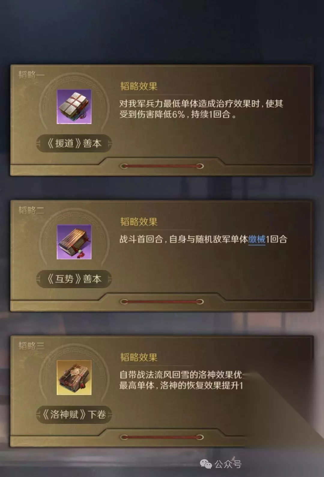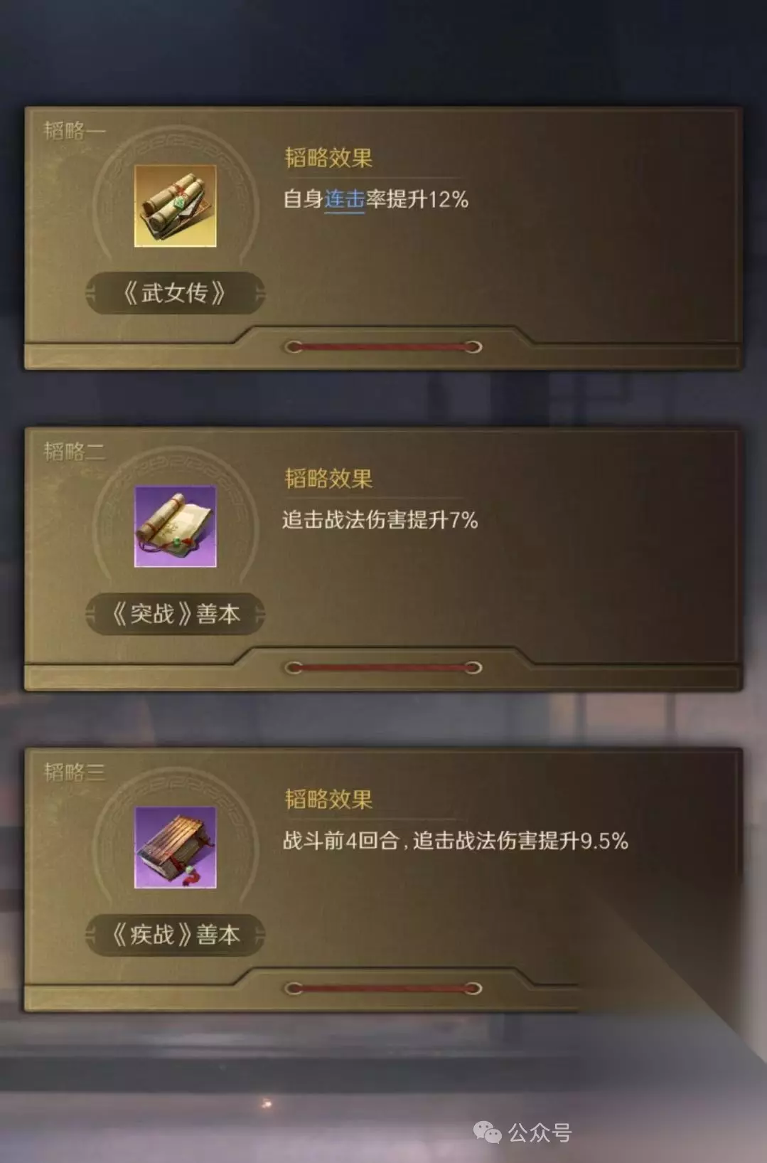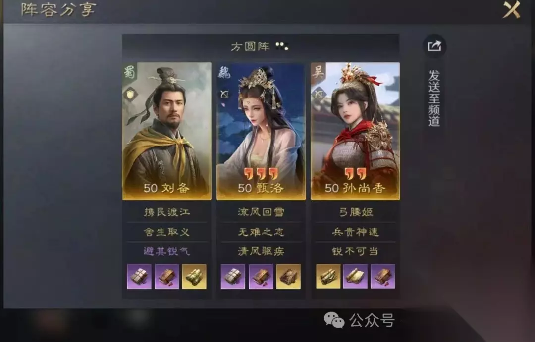 三、队伍搭配详解 1. 顶配战法组合 刘备:舍生取义 + 避其锐气 甄洛:无难之志 + 清风驱疾 孙尚香:兵贵神速 + 锐不可当 替代方案: 甄洛:无难之志 + 避其锐气 刘备:舍生取义 + 铸甲销戈 说明: – 清风驱疾更适合打铜雀弓 – 铸甲销戈可保障前期血量 2. 阵型与站位 阵型选择:方圆阵 站位策略: – 刘备、甄洛前排抗伤 – 孙尚香后排享受连击率加成 3. 战法选择分析 舍生取义:前期爆发输出核心 避其锐气:保障甄洛生存并辅助刘备 铸甲销戈 vs 清风驱疾:根据需求二选一 无难之志:建议优先保留 孙尚香输出战法:兵贵神速为必备 4. 兵书与加点 刘备:国志汉书金书 + 全智加点 甄洛:相怜洛神赋下金书 + 全统加点 孙尚香:增伤类金书 + 全武力加点