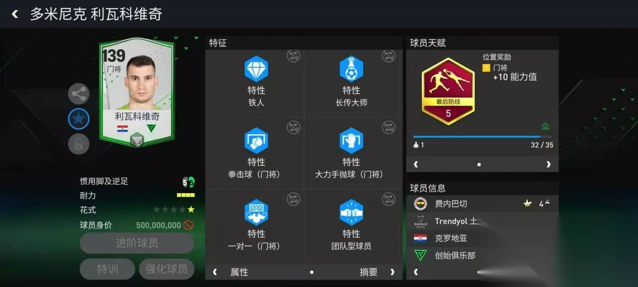 特性方面,利瓦科维奇配备了六项顶级特性,其中铁人增加了他的对抗能力,在出击的时候遇到干扰能够更加稳健;拳击球让他面对高空球时候可以及时用手挡出危险区域;大力手抛球让他可以丢出跨越半场的手抛球发动快速反击。