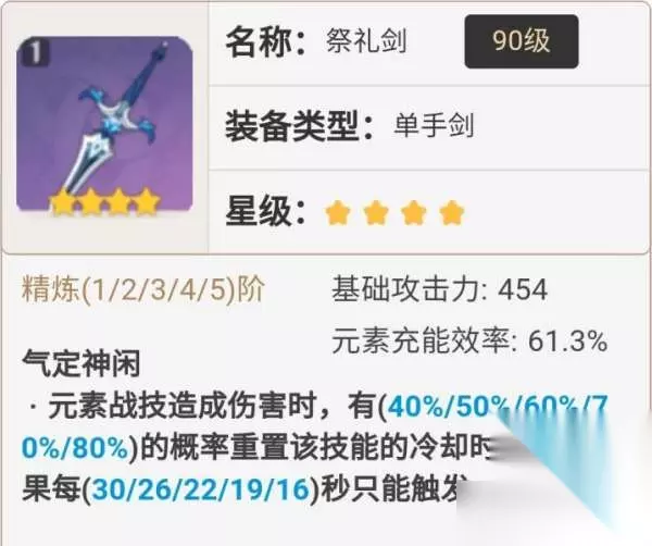 (6)【祭礼剑】 可以直接E两次的神剑,适合E冷却长的角色使用。 适用角色: 行秋:可以用这把剑搭配「绝缘套」,基本EE就充满的了,加上行秋本来就E冷却很长,有这把武器简直如虎添翼。 妮露:妮露不吃攻击力,所以这把剑可以用,刚好EEE触发水环,再EAAA一直A到结束的玩法,有很强大的水覆盖,但前提是也有很长的挂草后台角色才行。 莱依拉:像迪奥娜一样,可以再被破盾时补盾。