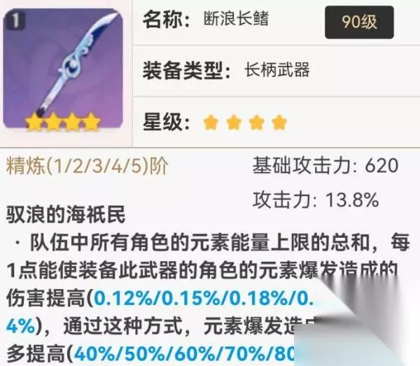 (5)【断浪长鳍】 这把有很高的基础攻击力,特效是专门给能量很高的队伍使用的。 适用角色: 雷神、香菱:两个角色能量都很高,刚好也能组成雷国队!!其中一个角色戴就好了。 申鹤:没有「息灾」时,这把可以当做下位替代,同样是高基础的武器,而且特效都跟大招有关。
