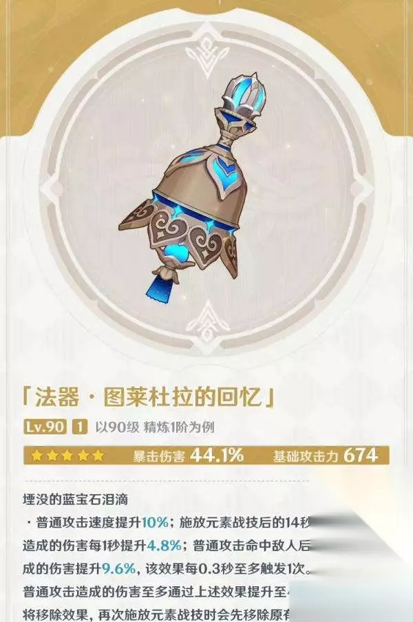 (1)【图莱杜拉的回忆】 这法器适合以普攻为主的法师使用,带有常驻普攻速度的提升,但是增伤需要用完E技能触发,更多是给开E后冷却较长或者开E改变攻击模式的法师使用,当然如果E冷却快的角色,你也可以自己E完不那么快的E第二次,让普攻特效吃满点也是可以用的。 适用角色:散兵、平藏、烟绯。只要是以普攻为主,或者普攻接重击的法师都可以用。