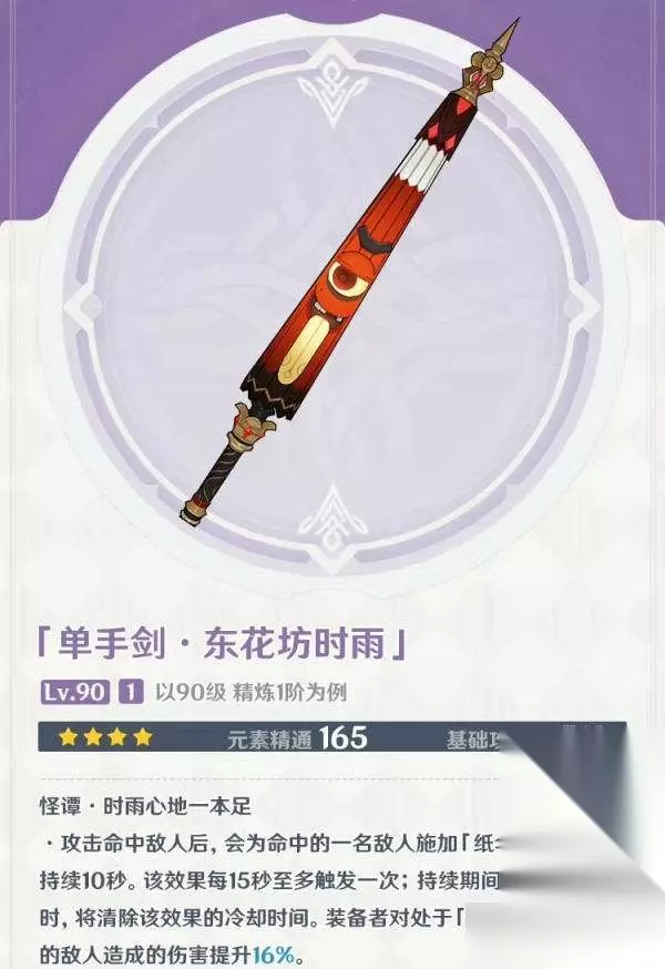 优菈:优菈每一层【冷酷之心】会增加30%防御力,总共60%。时之沙用防御力的话加上【冷酷之心】加上武器加持,然后武器的特效,也是可玩的玩法,专门普攻输出。(虽不推荐,但提高防御力也提高了站场能力,同时武器加持又提高了普攻项的伤害,是不错的选择。但对〖技能物伤无用〗就是了。并不会太改变优菈本质的东西,只是把更多的伤害用到了普攻上面。) 如果没有练荒泷一斗、女仆、辛焱的打算,这把武器就别抽了,没有别的角色适合戴的。未来肯定也会有别的大剑防御力角色可以用,但暂时没有玩以上角色的打算的话,不急于一时。 (3)【东花坊时雨】 这把是活动白嫖满精单手剑,对标铁蜂刺的,如果你有满精铁蜂刺,这把就可以不用了,否则这把也可以用,因为是白嫖满精,比锻造容易多了。 唯一的缺点就是特效只对单体生效,必须一个一个来,适合单怪场合,比如打boss。 适用角色:只要是可以用铁蜂刺的角色,都可以用这把。
