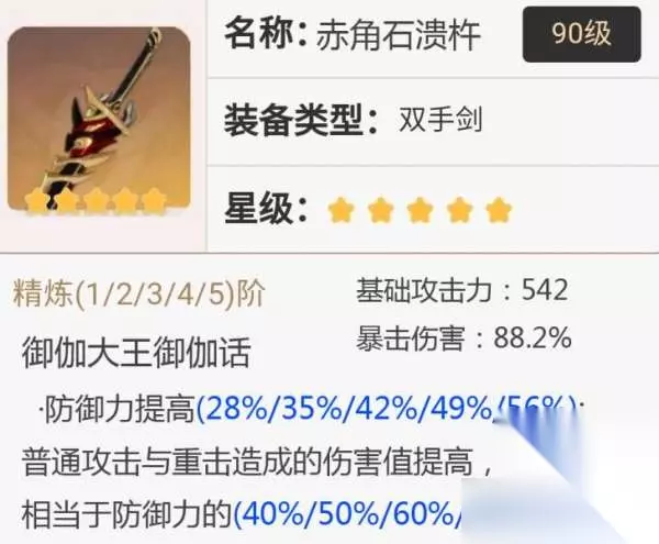 (2)【赤角石溃杵】 副词条为爆伤,特效加防御力,还根据防御力高低增加普攻和重击的伤害,这已经指明了三个角色。如果没玩这三个角色其中之一,都不推荐入手,因为除开这三个,没人适合了。