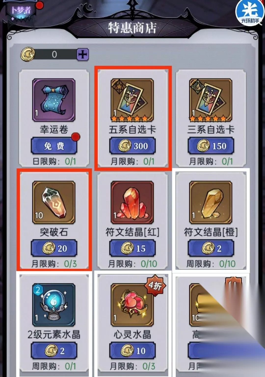 8、特惠商店 ①推荐换突破石 ②白雪等也可兑换(切勿购买三系自选卡) ③五系自选卡、橙结晶、2级自选元素、心灵、高能晶石均比较划算,都可兑换 ④特惠积分主要通过氪金获取
