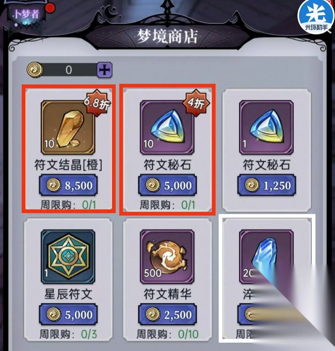 15、梦境商店 ①每周10*橙结晶+10*符文秘石必买 ②其他有需求自行购买 ③梦境商店的兑换道具为游乐之星,主要通过梦境之旅玩法获取,在梦境之旅中可以多多利用一些小技巧获取更多游乐之星