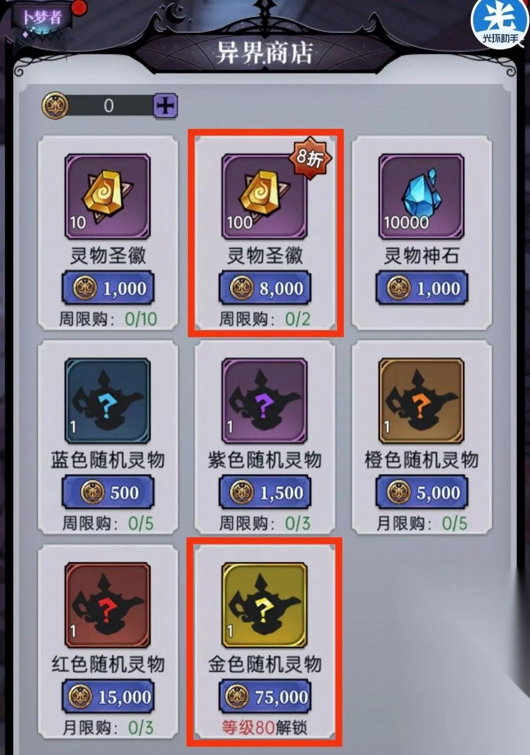 7、灵物商店 ①蓝、紫色灵物均不在我们的兑换范围 ②灵物圣徽可按需求自行兑换 ③橙、红色灵物去需求直接兑换即可 ④金色灵物推荐等灵物兑换活动(不定期)再兑换更值 ⑤灵物商店的兑换道具灵物金币、灵物银币主要通过灵物遗迹中消耗灵物劵获得,以及灵物一千抽和灵物兑换活动中获取,其中也可以通过分解满级灵物获得