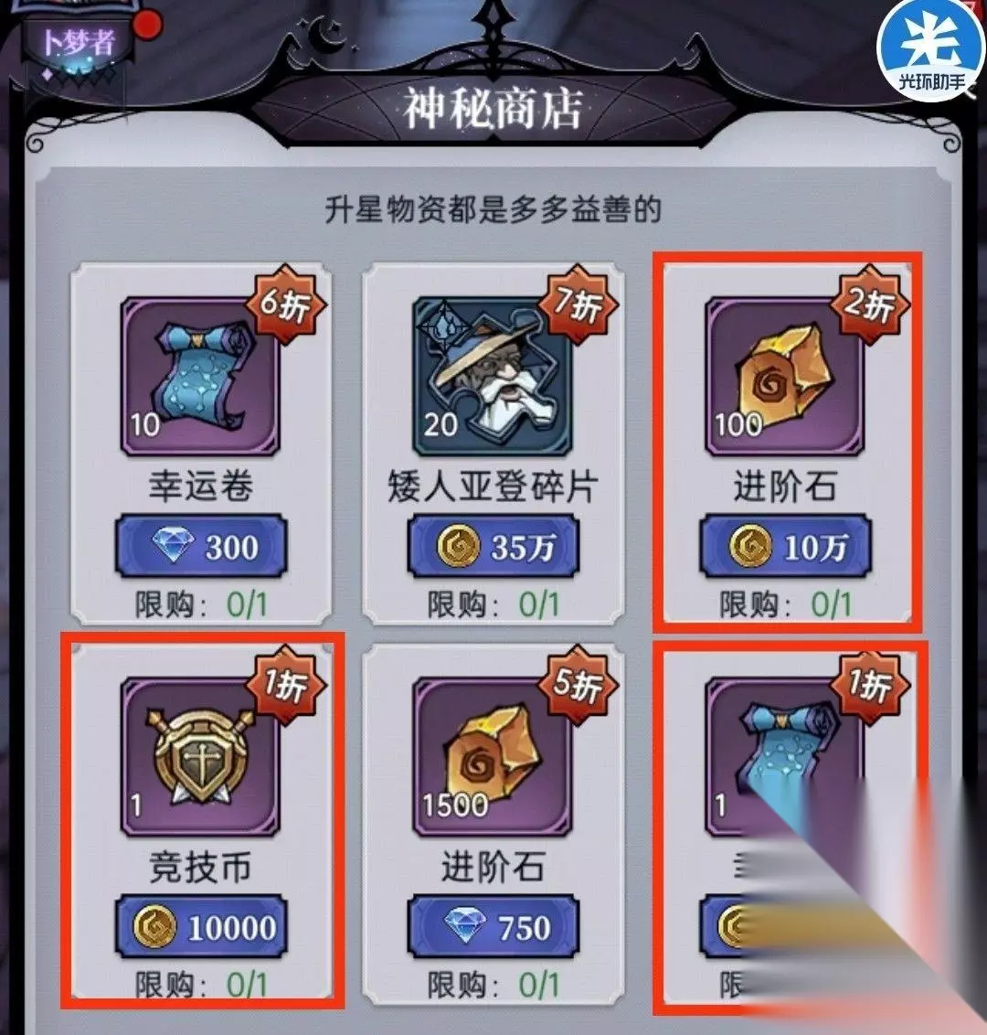 《魔镜物语》新·魔镜各商店甄选指南攻略 1、神秘商店 ①金币:进阶石、召唤晶石、竞技币、幸运卷、三系4星狗粮,此5类是必买的,稳赚不亏 其他的如:1星狗粮、 2星狗粮、紫装备都是不建议购买的,剩下的资源如:伙伴经验、自然符石、3星狗粮按需求自行兑换,1500万金币的随机金装看个人资源,金币多想买也可以买,但不推荐 ②钻石:在这方面推荐购买150钻的灵物秘轴都是很划算的(依照自己的钻石数量理性购买)然后其他70*的铸币等,有需求再自行购买,其他的都不推荐