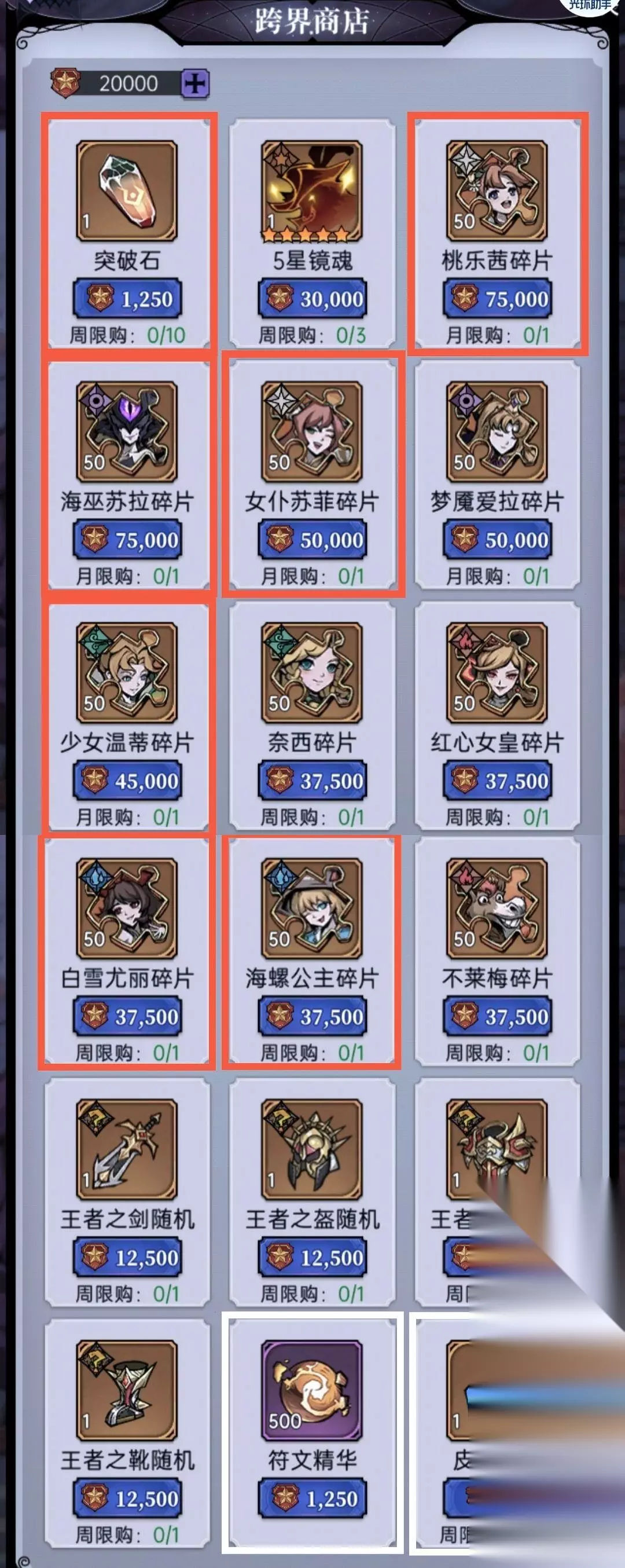 14、跨界商店①每周10*突破石必买 ②前期可自行选择兑换:白雪、海螺、温蒂、桃乐茜、章鱼、苏菲 ③有需求的可兑换10*皮肤碎片和符文精华,其他不推荐兑换 ④跨界商店的兑换道具为跨界积分,其获取途径为1.跨界天梯 2.跨界周冠 3.段位赛 这3个玩法都能获取不菲的跨界积分,多多积极参与