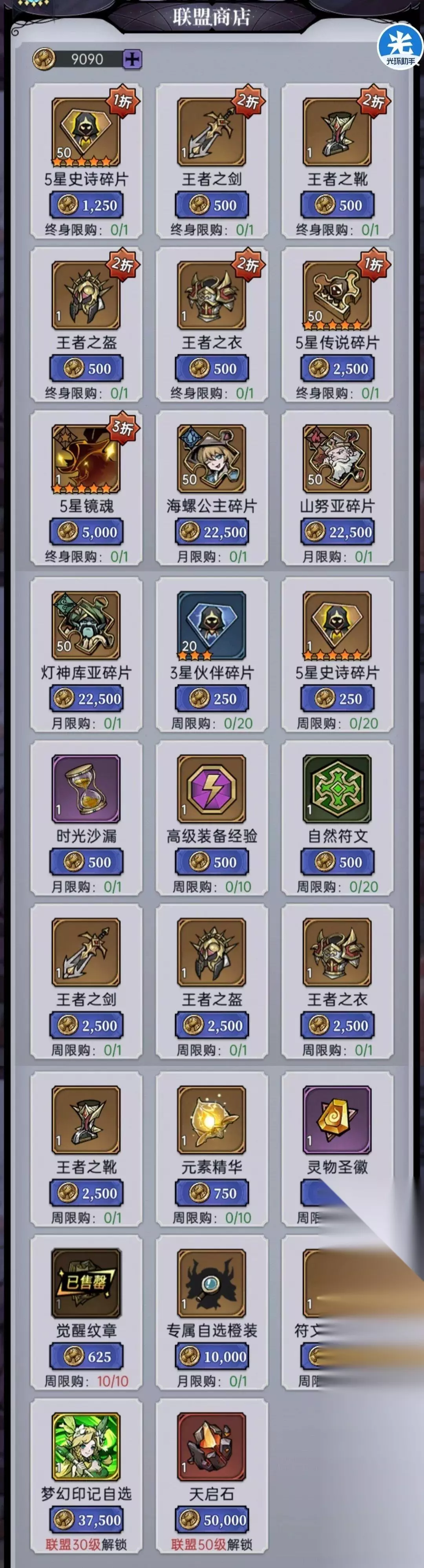 10、联盟商店 ①每周10*觉醒纹章(必买) ②海螺、山努亚、灯神都是很强力的英雄,可以慢慢攒联盟贡献币购买 ③每周的时光沙漏按需求兑换 ④永久限购的5星传说碎片+5星镜魂均可兑换 ⑤终身限购+周限购的装备均为白板,不是随机英雄专属装备,不要兑换 ⑥联盟商店的兑换道具为联盟贡献,主要通过我们日常的1.联盟捐献 2.联盟副本 3.联盟援助 4.联盟混战 其中联盟混战是我们最重要的获取途径,因此每周的3次盟战要记得报名参加 ⑦其他有需求的道具自行兑换