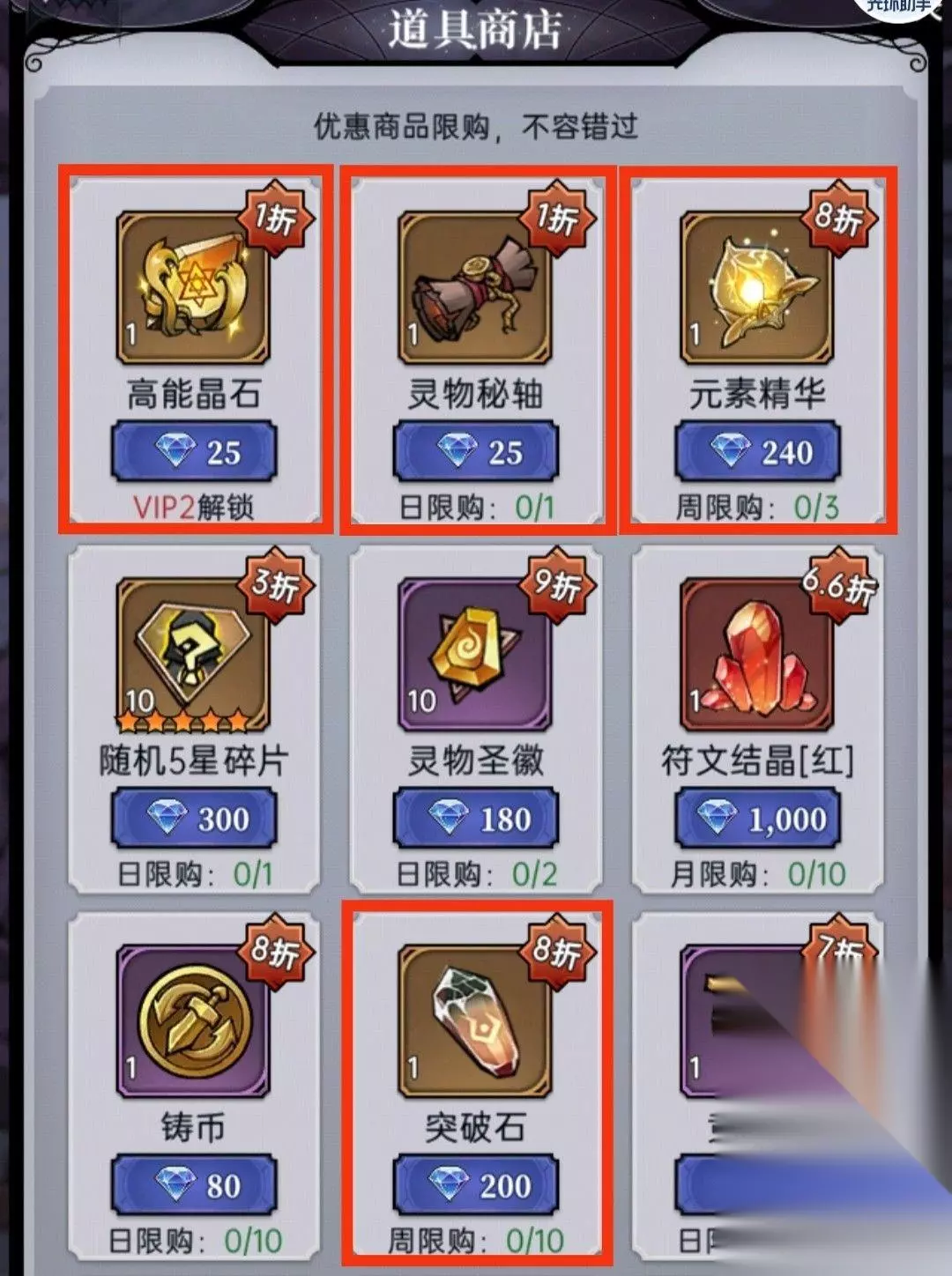 2、道具商店 ①日限购:每天刷新的25*高能晶石(V2解锁)和25*灵物秘轴(45级解锁)都是很值的 ②周限购:每星期的3*元素精华和10*突破石必买(实在钻少就不买),时光契约有需求再自行购买。剩下的资源都不建议购买,如果有需求自行购买