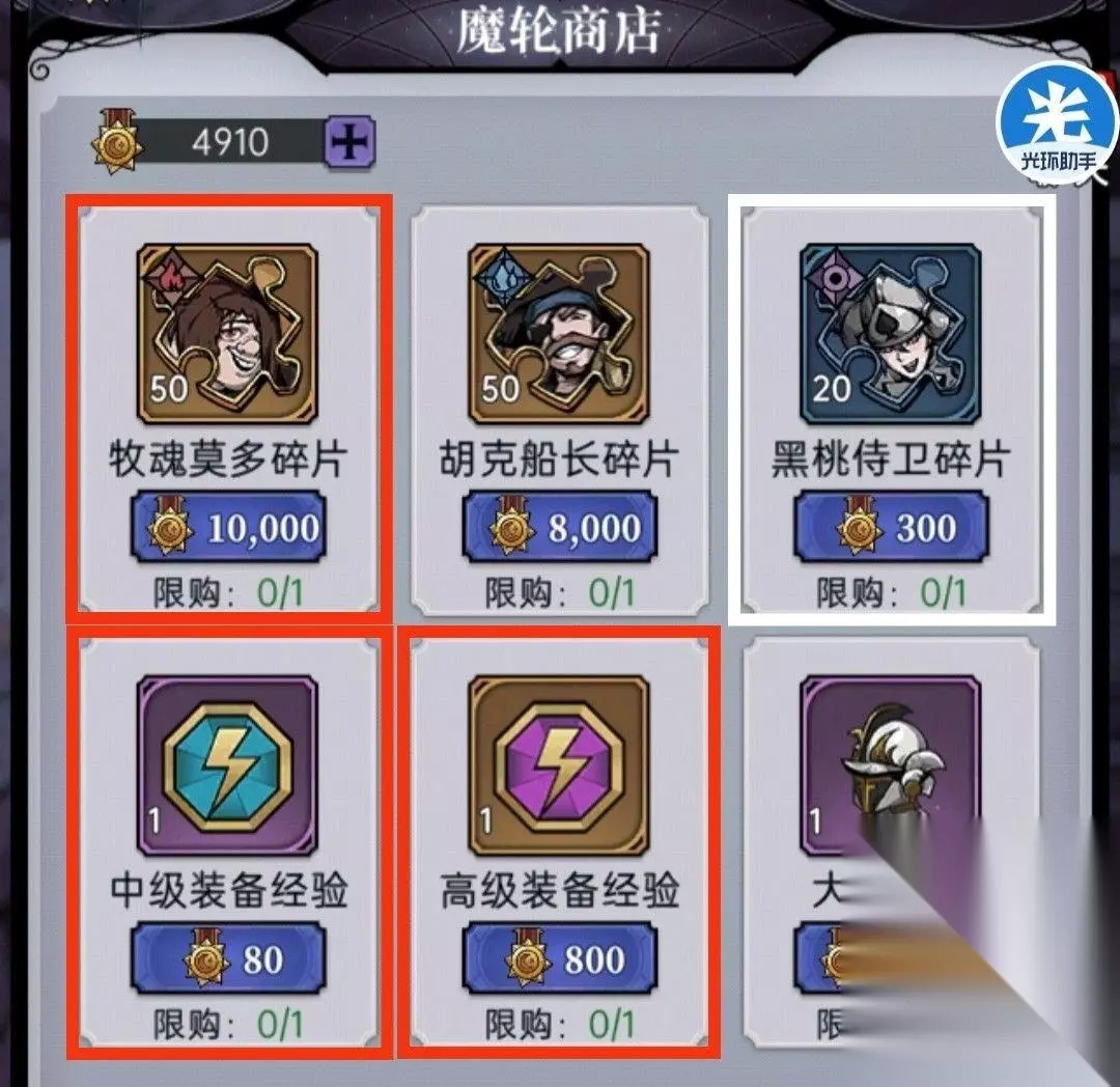 9、魔轮商店 ①魔轮商店中的英雄都是三系传说英雄,所以推荐购买莫多(有需求) ②中后期建议购买装备经验 ③铸币和三系光暗狗粮按需求兑换 ④该商店道具魔轮积分主要通过使用幸运劵、奇迹劵转换,其中幸运魔轮的大奖保底次数为120次,奇迹魔轮的大奖保底次数为50次