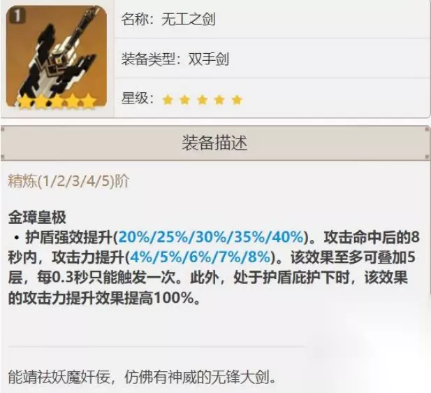 原神无工大剑给谁用比较好 在原神游戏中,无工大剑给迪卢克、优菈、雷泽这种战场的主c,想要吃满无工大剑的被动需要再带一个套盾的辅助角色,例如钟离、迪奥娜这种辅助角色套盾。 白值属性属于五星武器中等水平,由于副属性是攻击力百分比,对圣遗物双暴要求就更高了。这对于副属性是攻击力百分比的无工之剑来说完全背道而驰了。