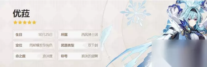 2、优菈: 截止2.6版本物理输出最强角色,虽然吃命座,但没有合适主c情况下练优菈不亏,适用于很多场合。优菈的最佳武器是松籁响起之时,没抽到的玩家使用无工也是很强力的。