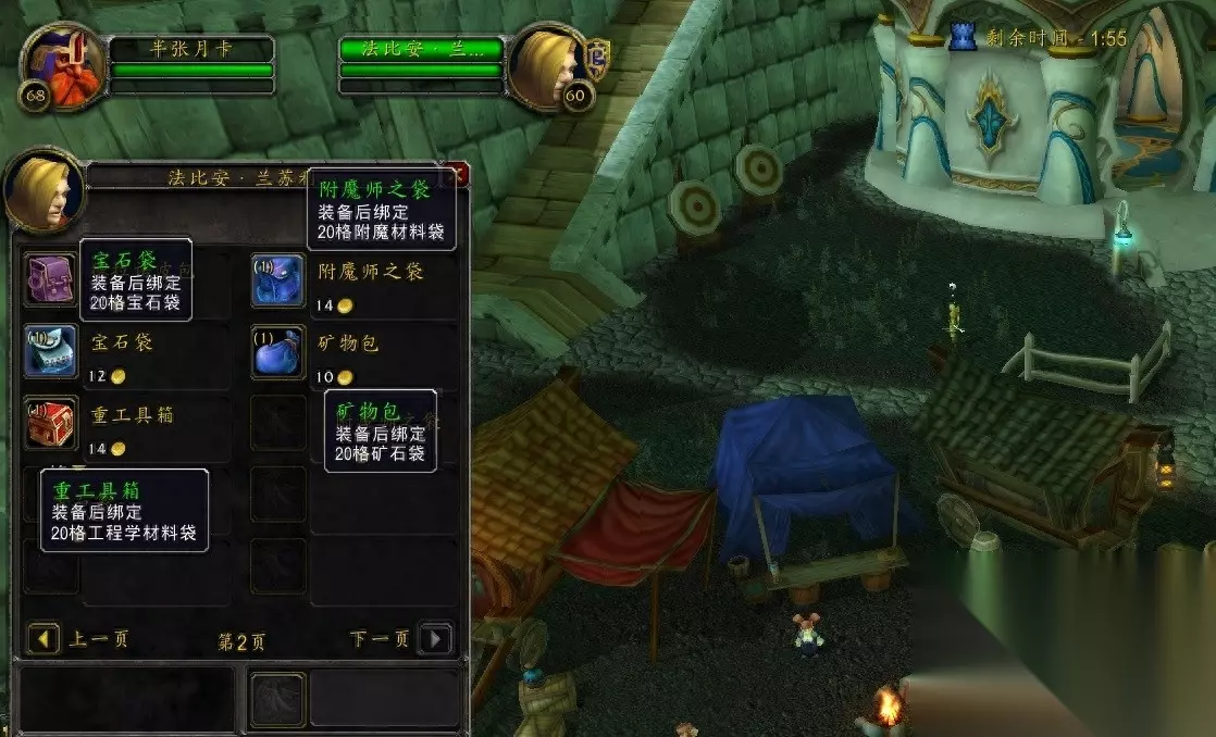 因为这里不仅有任务、旅店以及补给外,更关键的是有两样小号“神器”! 一,这里有个叫“法比安·兰苏利”的人类NPC,会限定出售低级背包,以及各种材料的20格背包! 低级背包不划算,可以无视。关键是那4种材料背包,对于小号来说绝对良心! 分别是附魔材料袋、宝石袋、矿石袋、工程学材料袋,都是20格的空间!虽不是终极版的,但也可以为你的仓库节省下不少空间!