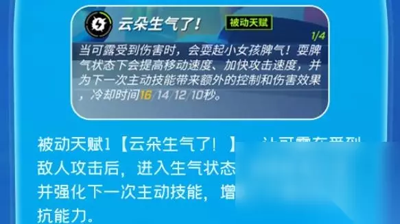 2、云朵愤怒了 讲解:被迫天赋[云朵愤怒了 ],让可露在受到仇人袭击后,加入愤怒状况,提升移速攻速并加强下一次积极技能,加强了可露的正面临抗能力。