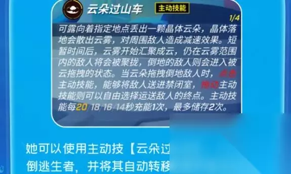 逃跑吧少年新角色顽皮云技能讲解 上线时间:5月31日 新追捕角色:可露 角色背景讲解: 油滑云·可露是一位含有全新放弃手法的追捕者,要留心她的云朵。 定位: 倒地的逃生者将会被其自动迁移转变至禁闭室内进行落选,同时可露还含有超强的守门能力。 调皮云的技能 1、云朵过山车 讲解:使用积极技[云朵过山车],来辅助击倒逃生者,并将其自动转移到禁闭室内放弃。