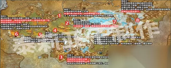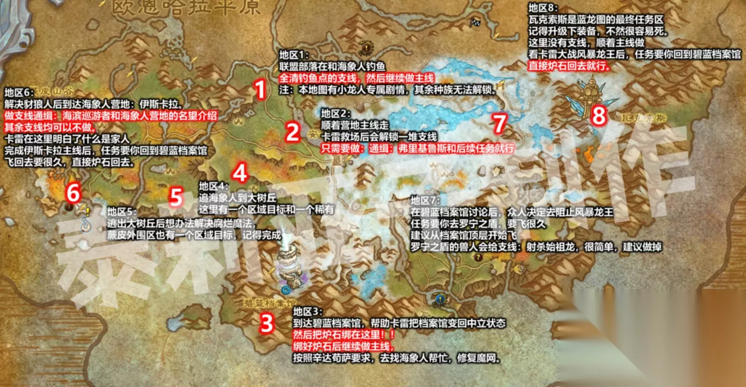 1.联盟部落在和海象人钓鱼,全清钓鱼点的支线,然后前往达拉然前哨站:安东尼达斯营地。 注:本地图有小龙人专属剧情,其余种族无法解锁。 2.顺着营地的主线做,卡雷救场后会解锁一堆支线,只需要做:通缉:弗里基鲁斯和后续任务就行 3.到达碧蓝档案馆,帮助卡雷把档案馆变回中立状态,然后把炉石绑在这里!! 绑好炉石后继续做主线,按照辛达苟萨要求,去找海象人帮忙,修复魔网。 4.追海象人到大树丘,这里有一个区域目标和一个稀有,记得杀。 豺狼人正在打算用腐烂魔法把碧蓝林海变成腐烂林海 5.逃出大树丘后想办法解决腐烂魔法,蕨皮外围区也有一个区域目标,记得完成 和卡雷解决了腐烂魔法,然后去海象人营地。 6.到达海象人营地:伊斯卡拉。 做支线通缉:海滨巡游者和海象人营地的名望介绍,其余支线均可以不做。 卡雷在这里明白了什么是家人 完成伊斯卡拉主线后,任务要你回到碧蓝档案馆,飞回去要很久,直接炉石回去。 7.在碧蓝档案馆讨论后,众人决定去阻止风暴龙王 任务要你去罗宁之盾,要飞很久,建议从档案馆顶层开始飞 罗宁之盾的兽人会给支线:射杀始祖龙,很简单,建议做掉 8.瓦克索斯是蓝龙图的最终任务区,记得升级下装备,不然很容易死。 这里没有支线,顺着主线做,看卡雷大战风暴龙王后,任务要你回到碧蓝档案馆,直接炉石回去就行。