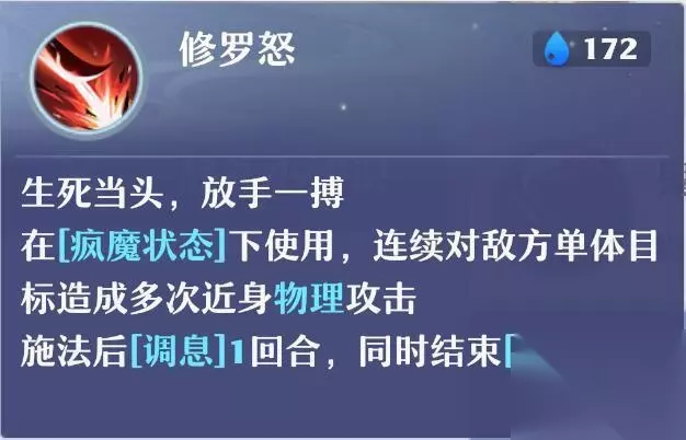 3、修罗怒:单体技能的天花板,建议等疯魔buff用完了再使用。