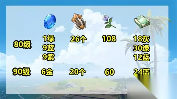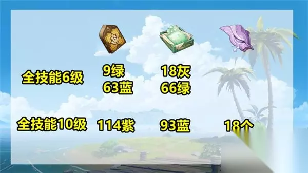 突破90级额外需要6块金色水玉、20个永续机芯、60个帕蒂莎兰、24个蓝色孢囊晶尘。 妮露升级天赋需要消耗笃行书、孢囊晶尘、祸神之褉泪。全技能6级需要9本绿色笃行书、63本蓝色笃行书、18个灰色孢囊晶尘、66个绿色孢囊晶尘。 全技能10级,需要额外消耗114本紫色笃行书、93个蓝色孢囊晶尘、18个祸神之褉泪。