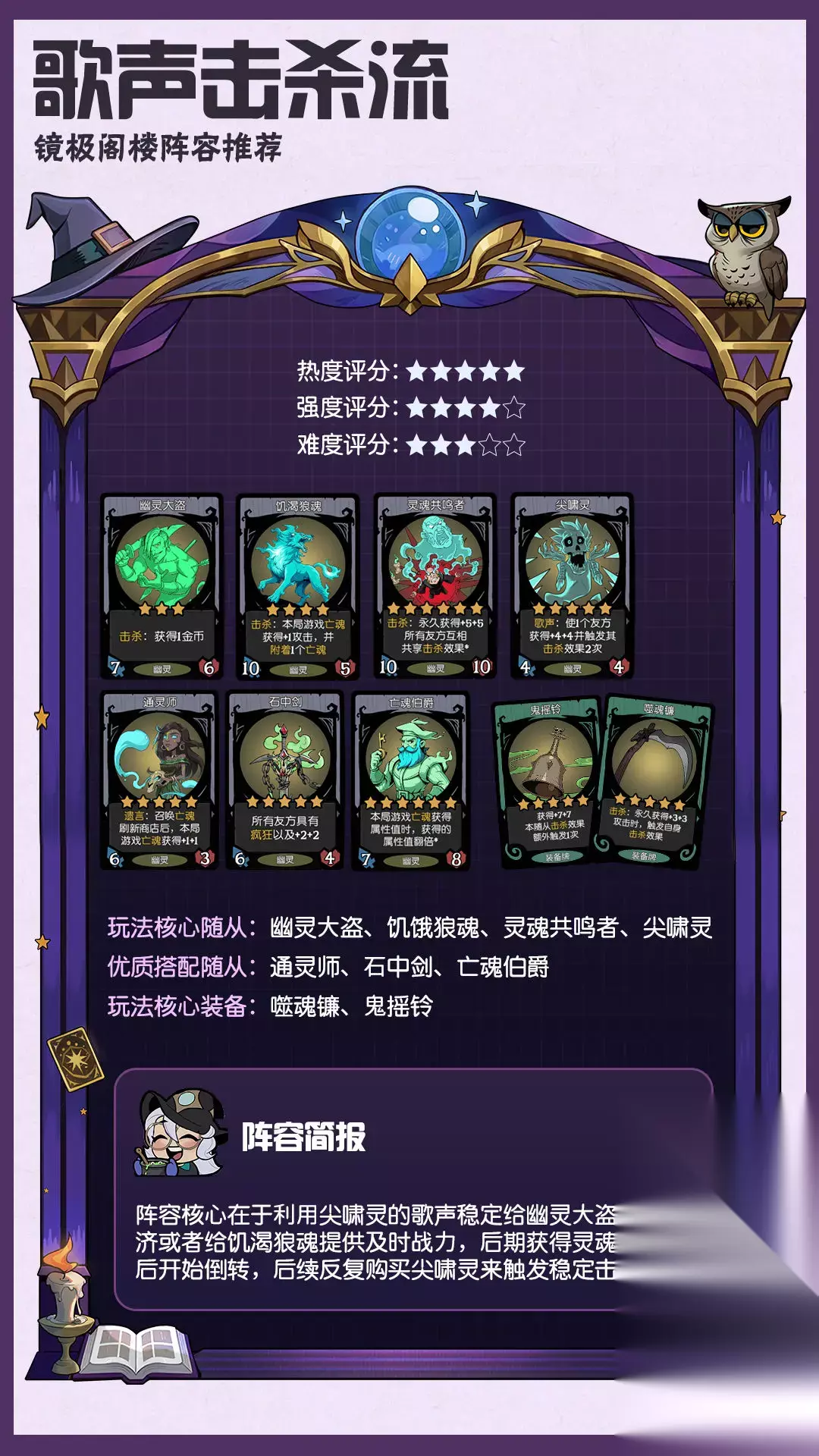 三、幽灵种族阵容 1、幽灵抉择流 核心随从:情圣、先王的怨念、魅影、古堡幽灵。 玩法思路:通过情圣、先王的怨念和魅影的搭配达到快速刷抉择牌的效果,重点发育古堡幽灵和亡魂的身材。该阵容以古堡幽灵作为主战力,亡魂流玩法为辅助战力。 2、抉择贴膜流(幽灵星裔贴膜流) 核心思路:需要有幽灵、星裔的种族。通过幽灵抉择流的玩法在手里积攒大量的附着亡魂,同时兼具发育亡魂身材。在最终决战里上场积攒好的各种族的胚子,再通过星系建筑师的共享附着效果来为全队随从贴膜,以达到翻倍全队战力的效果。