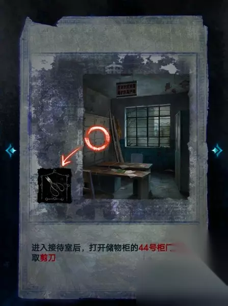 6、进入接待室后,打开44号储物柜,拾取其中的剪刀。