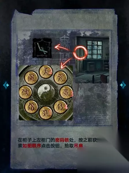 10、在院子左下角寿衣场景拿出照片获得密码打开左侧小院门,拉动磁带观察红点所在的位置按顺序转缝纫机(图七没记录下来,凭印象的顺序,不一定对)获得浇水,用铁丝枪开右手边衣柜门(高能)获得壁斗和线索,用剪刀剪下布娃娃的头。