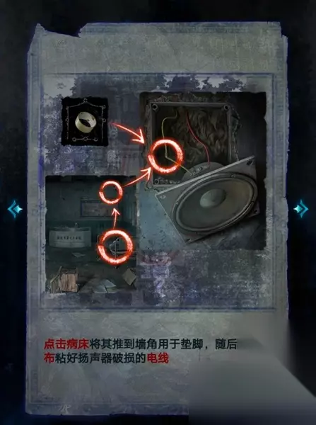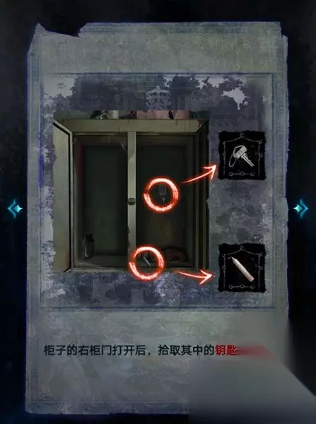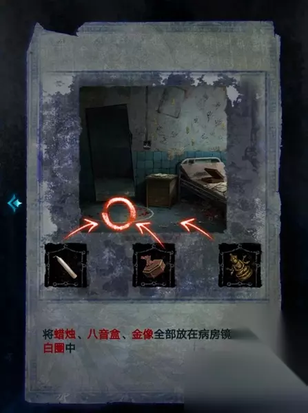 25、接着返回病房,将蜡烛、八音盒、金佛像放入镜子前的白圈中,就可以通过第一章了。