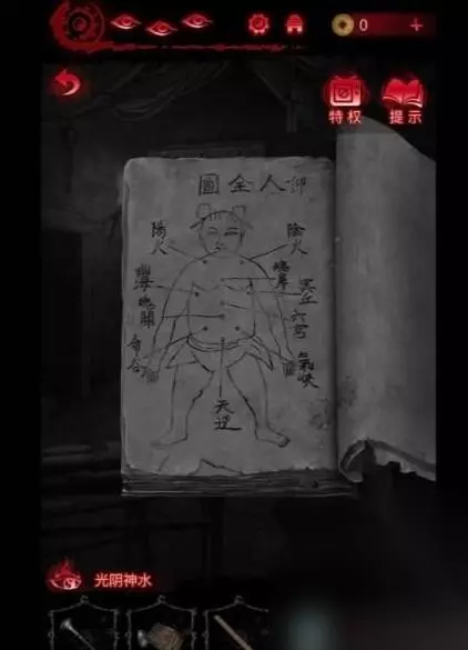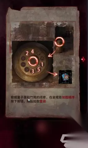 11、把木头蜡烛放炕里,加热壁斗,不要点桌子会降低精神值。 12、回地下室桌上放鸡蛋胶水沙子布娃娃的头做不倒翁拿到书。 13、把金箔放到肖家右手边神龛获得布帛,拿去左边屋子用壁斗烫,桌面上要摆个钟,根据衣柜书籍线索烫相应的秒数(也可以看到图案完全显现就换),然后获得帛画。 14、把帛画放到地下室地面上的砖,出现一个倒的塔,按图点击,用铁锹开最上面一层(高能)。 第四章攻略 1、纸嫁衣6无间梦境千秋魇第四章先右侧闻谕殿石阶上得到火镰,用火镰点燃桌子上的木船得到赤爪实和方砖,看两本书,左侧神龛有一把尺子。 2、根据书上和地上的提示用唢呐吹奏56545,前往地下室。 3、用火镰打开桌子上的蜡烛,拾取面具和铃铛。 4、看大巫贤后面的书,根据医书解开柜子上的盒子的五行相对(可以跳过)得到针和锤子。