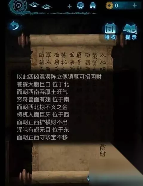 14、把洿泽木雕摆放到庭院石人身边,获得提示,收回木雕,根据提示道心亡心若人,点击铜镜得到红尘愿。 15、把木雕给奚月遥,根据卷轴和竹简按照鹦鹉,蝙蝠,山魈,洿泽的顺序摆放,得到长生愿。