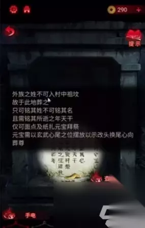 2、用手电照到墙上就会出现文字线索,照射墓碑会出现相关文字,到吴某的墓碑后会出现一个怪女人。
