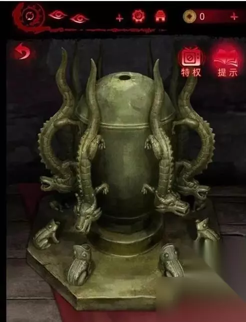 10、用火把把庙烧了,获得王相愿和弓箭,在水池边把咒符射到对面,切换视角得到咒符,把咒符贴到屋内铜人脸上,得到青铜球和小铜船,把小铜球放入地动仪里【地动仪,铜镜,铜鼎在迷宫里,可以自己走】,根据铜鼎上的图案换地动仪的龙和蛤蟆图案,走向出口。
