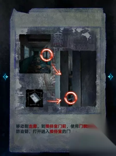 5、接着来到走廊,用门禁卡挑开接待室的防盗链,进入接待室中。